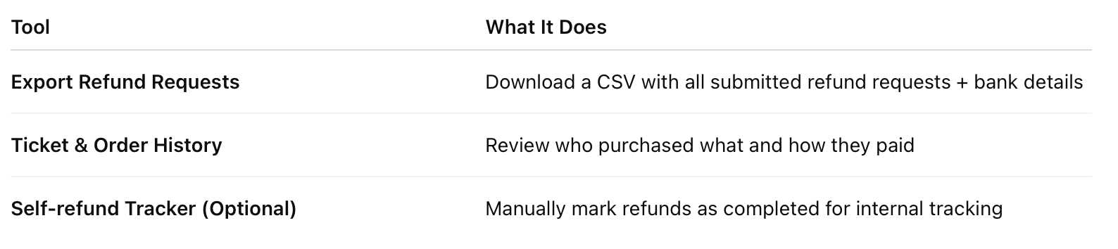 In some cases, organisers choose to manage refunds themselves — especially when dealing with cash sales, offline tickets, or when funds have already been settled.