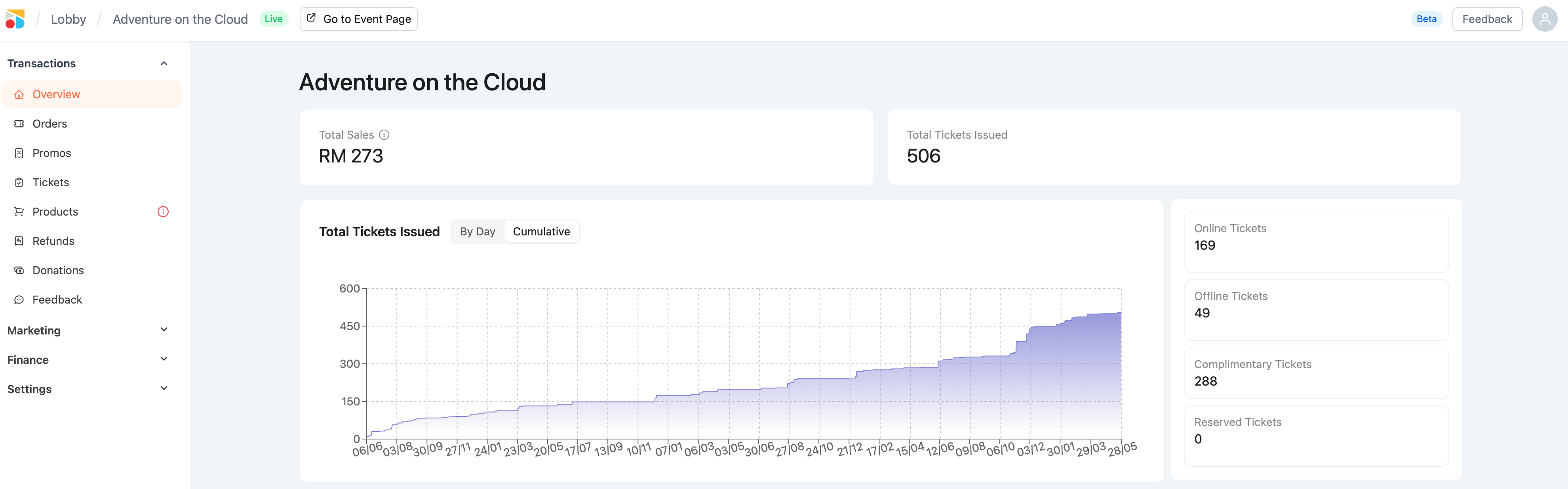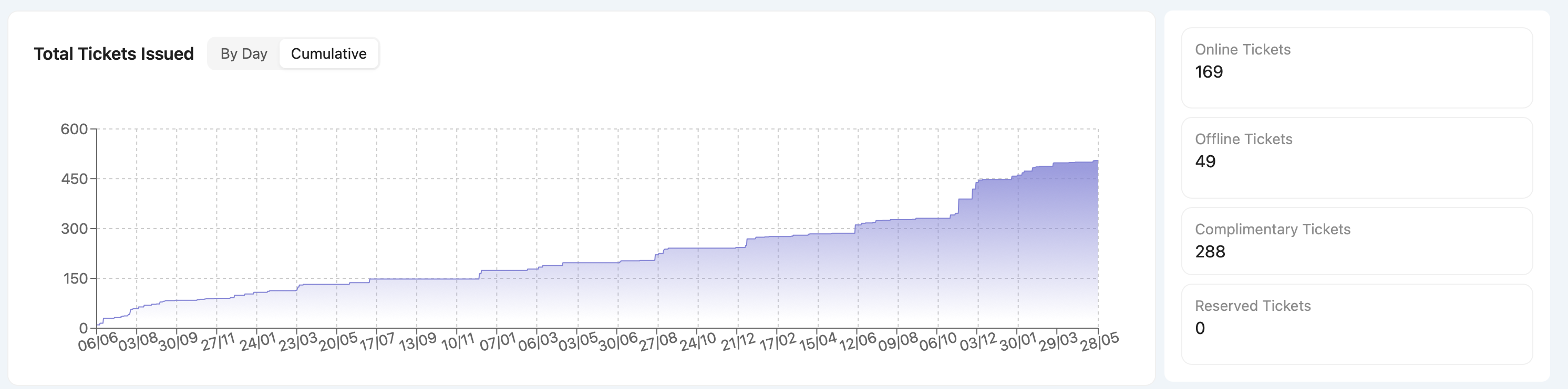 Once your event goes live, this is the first place you’ll want to check. The Overview Dashboard gives you a real-time snapshot of how your event is performing — from sales and ticket types to capacity and daily trends. It’s like your front-of-house report, but smarter, prettier, and always up to date.