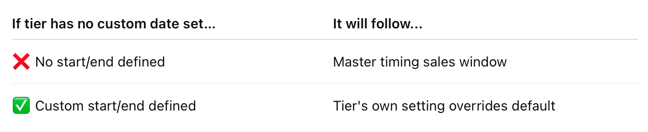 If you don’t set specific dates here, it will inherit the sales window from the master event timing.