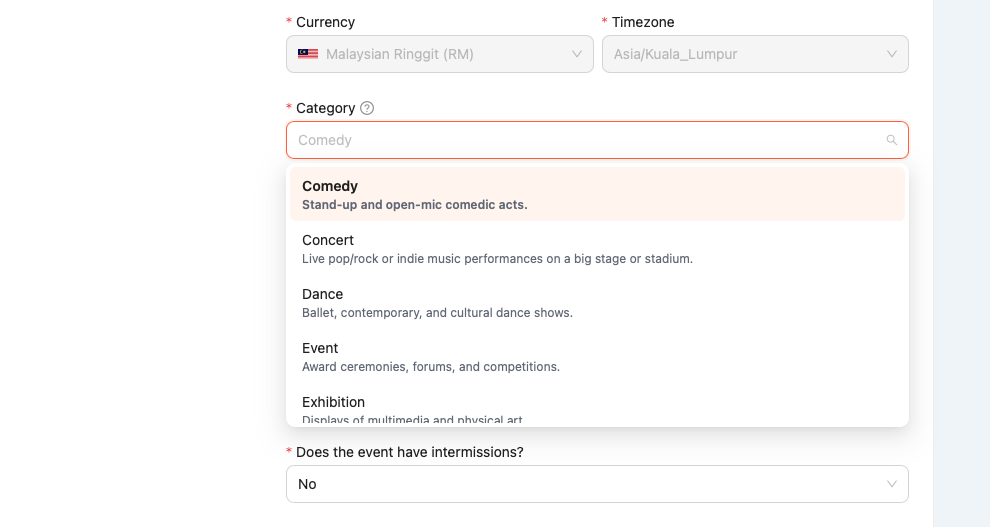 Choose the category that best fits your event (e.g. Comedy, Music, Theatre).