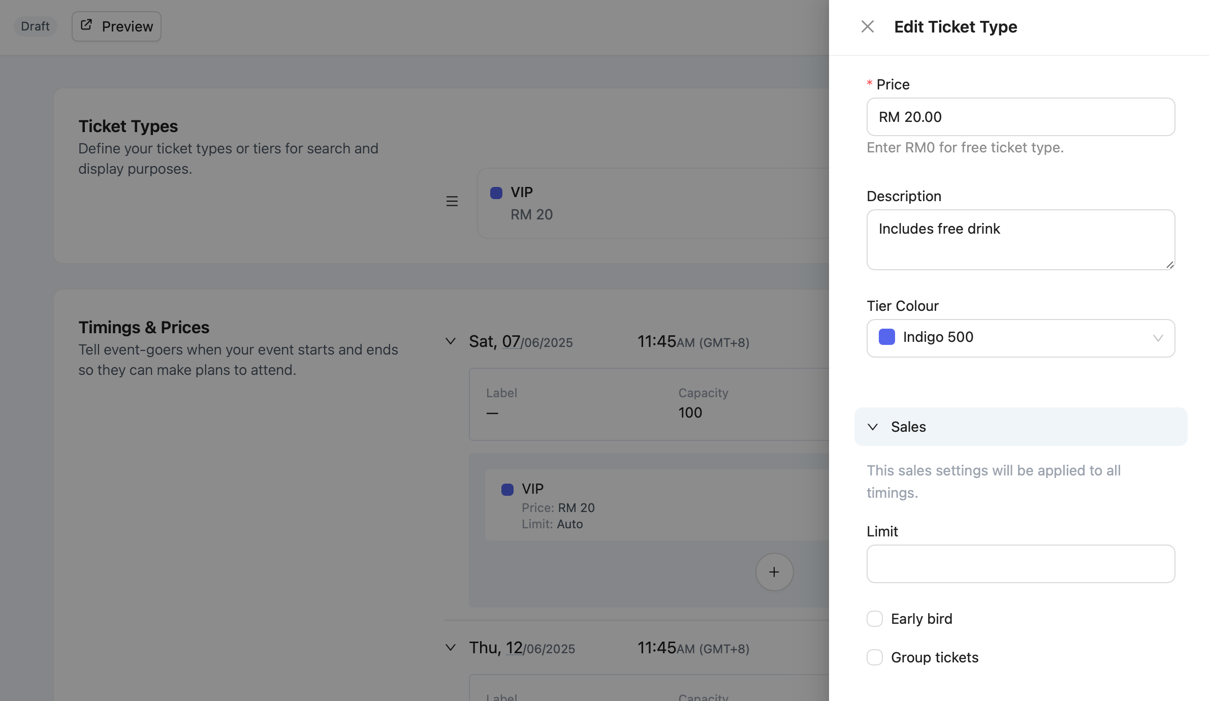 Once a ticket type has been sold, only the description and limit can be edited.
