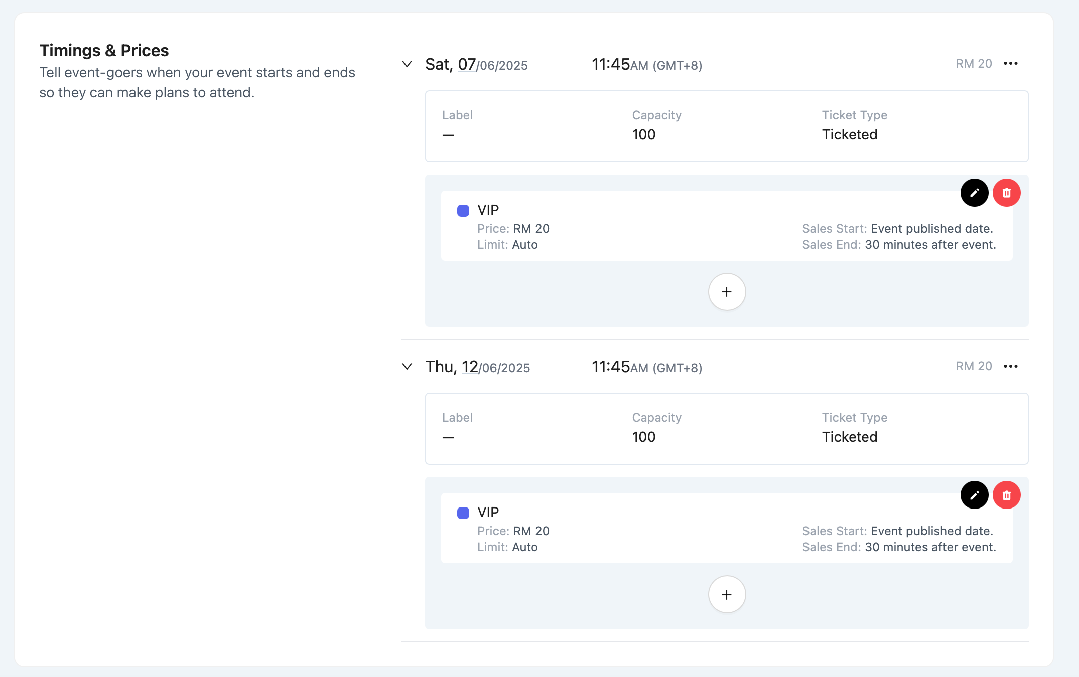 💡 Capacity for each timing is shared across all ticket tiers assigned to it.